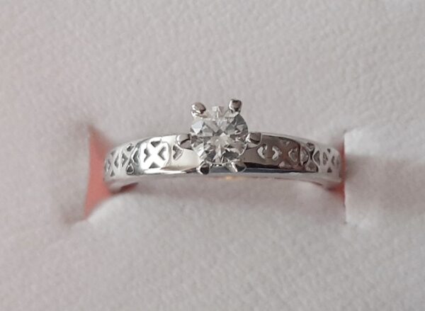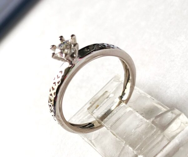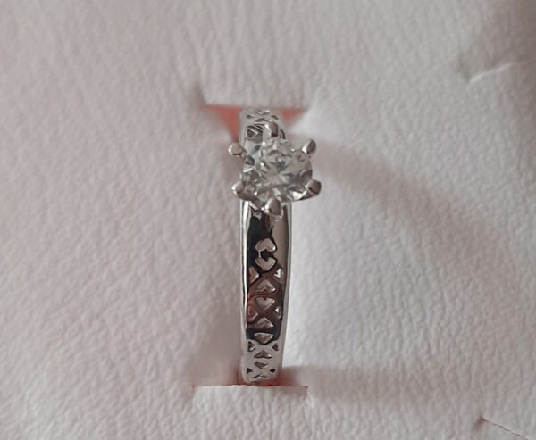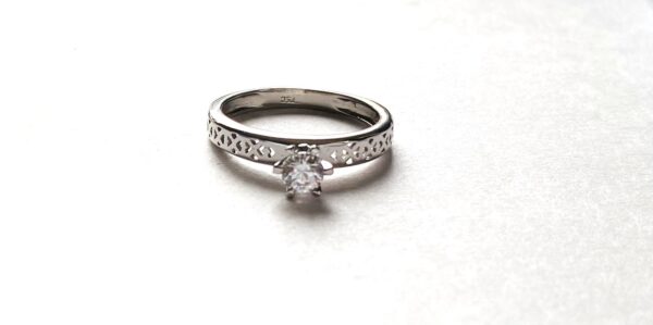 Anillo Oro Blanco con Circón sostenido en 6 uñas con bello aro calado para resaltar su elegancia