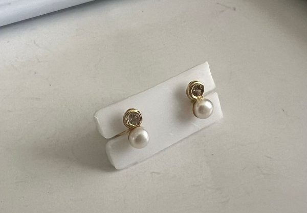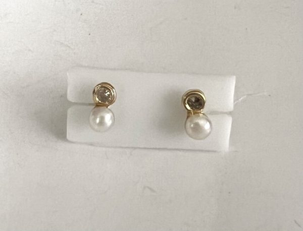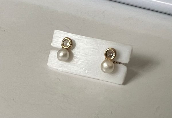 Aretes Oro 18 Kilates broche de seguridad tapa rosca perla natural y circones